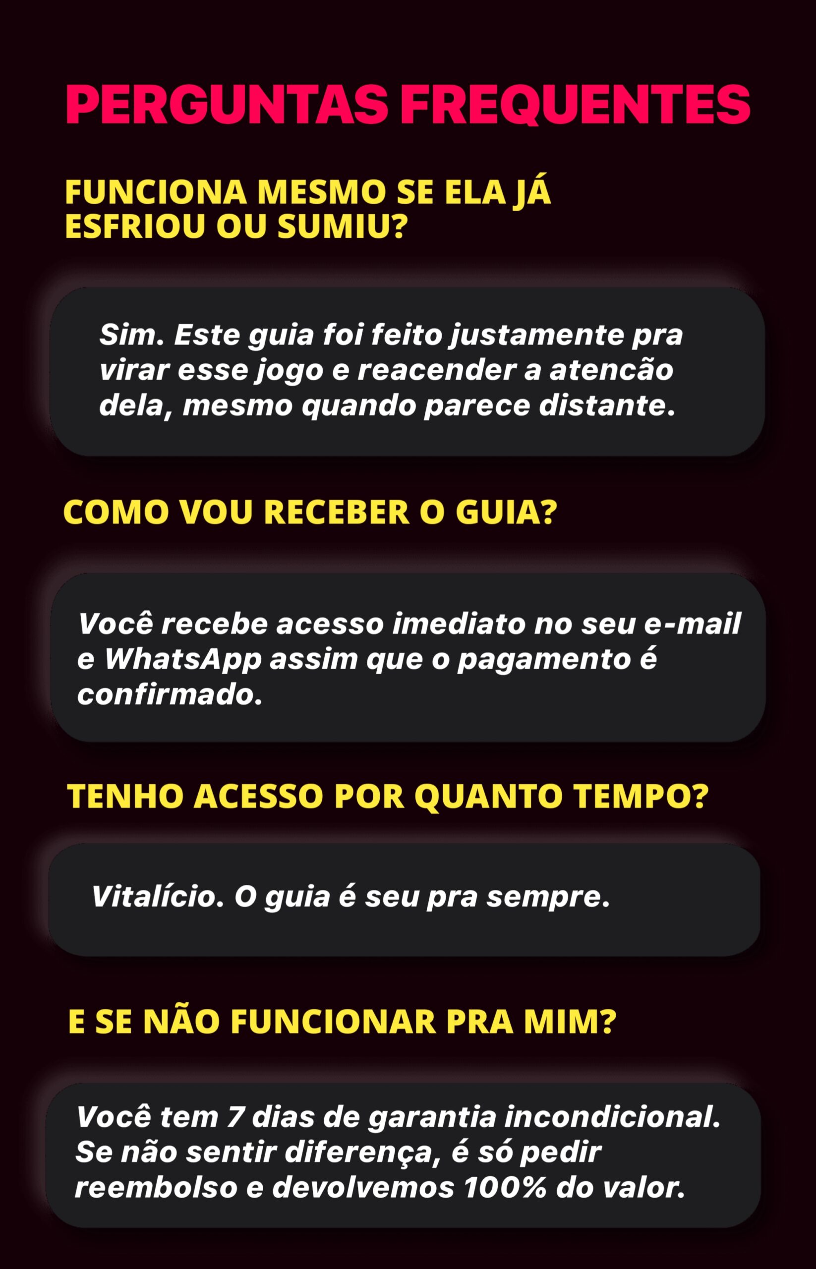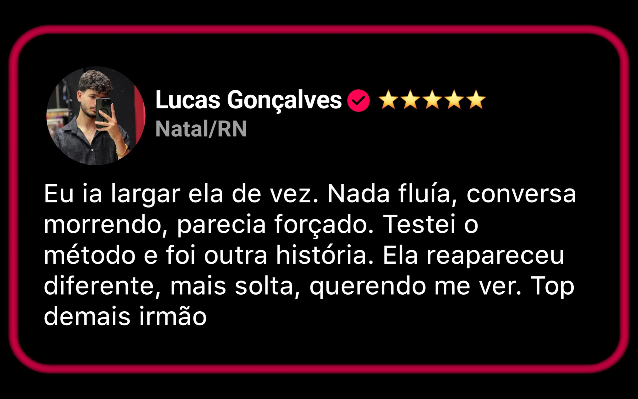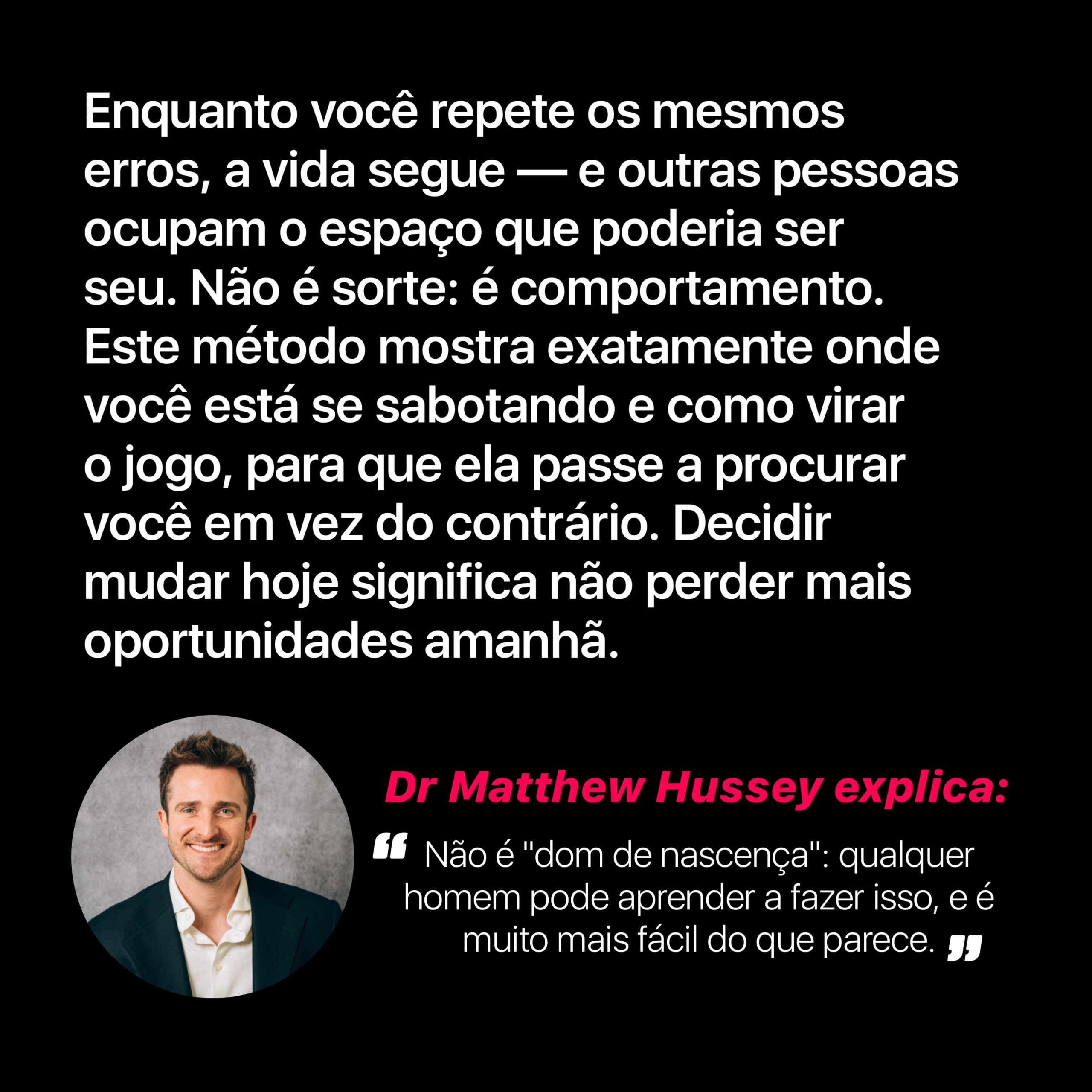 Ao navegar por nossas seções, você encontrará informações sobre os comportamentos que fazem um homem perder valor sem perceber e aprenderá como reverter essa lógica. O objetivo principal é fazer com que o interesse venha dela, através de uma mudança real de postura e mentalidade.